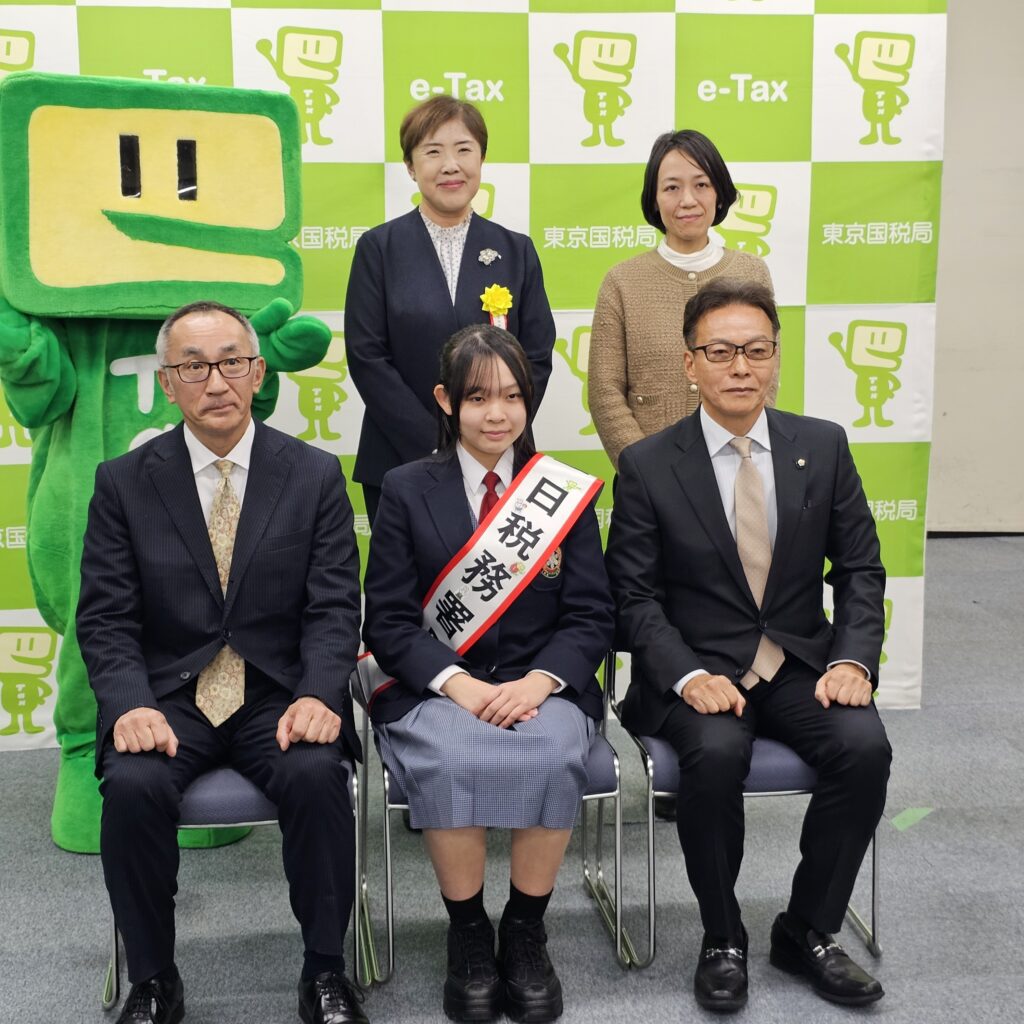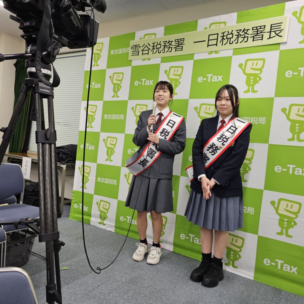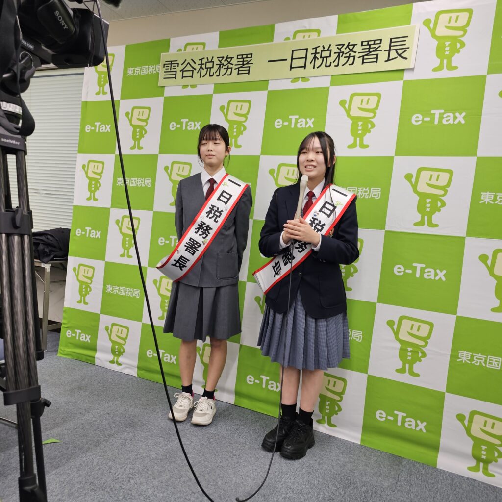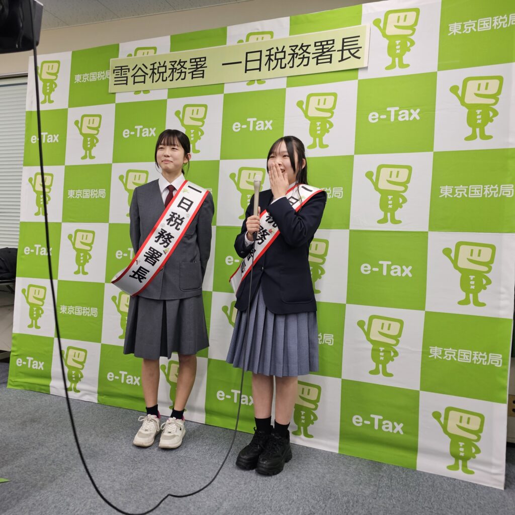 今年度の⼀⽇税務署⻑は、髙田幸恵さん(大田区立雪谷中学校3年・全国納税貯蓄組合連合会会長賞を受賞)と𠮷戸彩夏さん(大田区立大森第十中学校3年・東京国税局長賞を受賞)と中村朋佳さん(大田区立大森第七中学校3年・東京国税局管内納税貯蓄組合連合会優秀賞を受賞)の3人が選任されました。当日は、髙田さんと𠮷戸さんが出席し、幡野雪谷税務署長から委嘱状とタスキを、伊藤雪谷納税貯蓄組合連合会会⻑から記念品が授与された後、「名刺交換」や「署内における事務処理確認」などの署⻑業務を体験しました。