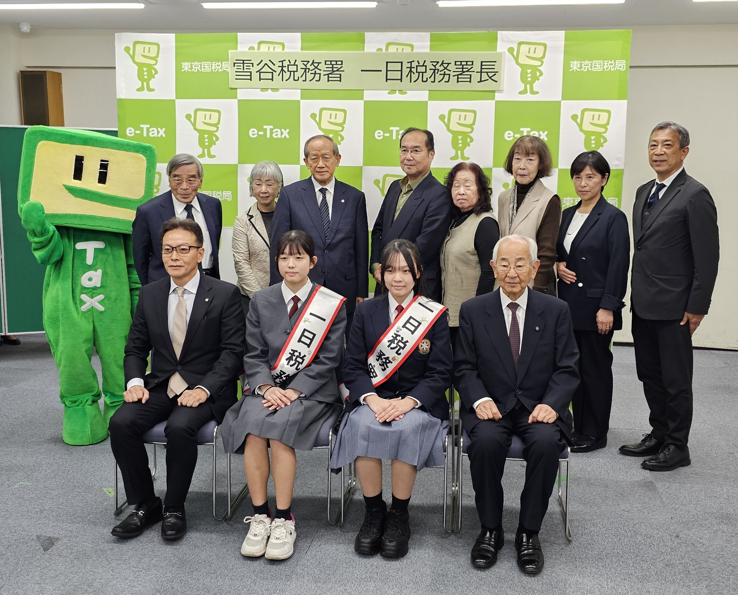 今年度の⼀⽇税務署⻑は、髙田幸恵さん(大田区立雪谷中学校3年・全国納税貯蓄組合連合会会長賞を受賞)と𠮷戸彩夏さん(大田区立大森第十中学校3年・東京国税局長賞を受賞)と中村朋佳さん(大田区立大森第七中学校3年・東京国税局管内納税貯蓄組合連合会優秀賞を受賞)の3人が選任されました。当日は、髙田さんと𠮷戸さんが出席し、幡野雪谷税務署長から委嘱状とタスキを、伊藤雪谷納税貯蓄組合連合会会⻑から記念品が授与された後、「名刺交換」や「署内における事務処理確認」などの署⻑業務を体験しました。