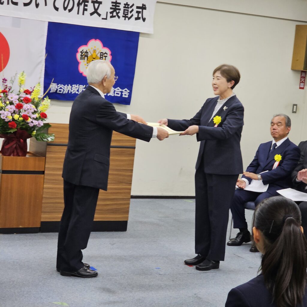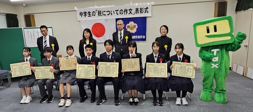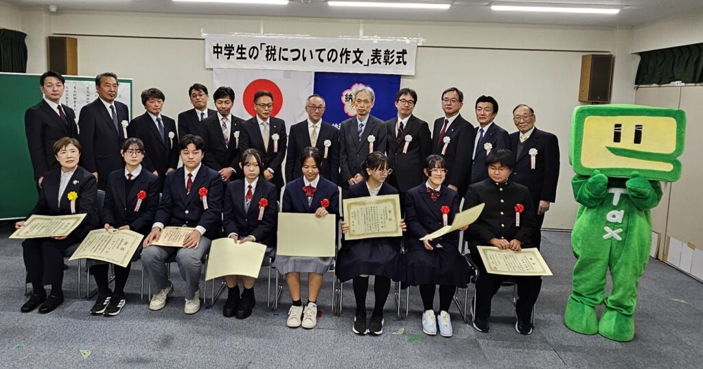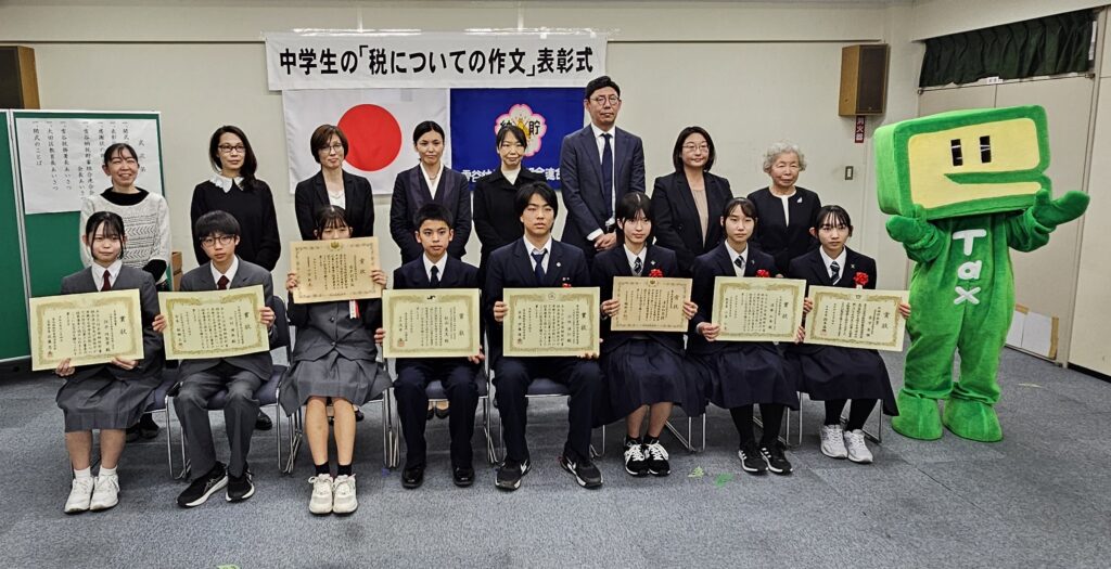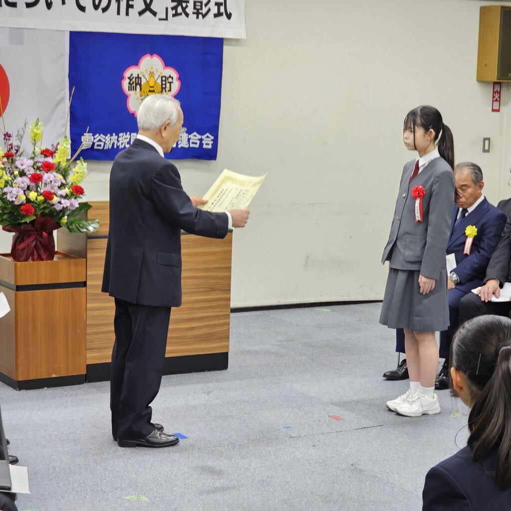 中学生の税についての作文表彰式 活動報告 2025.12.07 令和7年12 ⽉4⽇雪⾕税務署にて、「中学⽣の税についての作⽂表彰式」を開催しました。当⽇は、多数の参列者が⾒守る中、優秀賞受賞の⽣徒さんたちに対して、賞状と記念品等が贈呈されました。