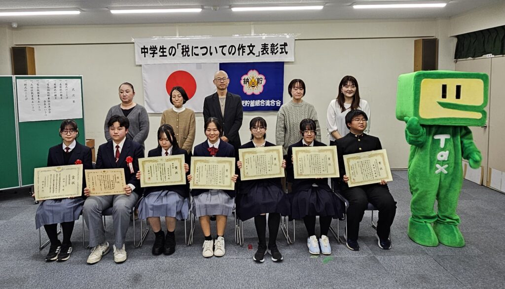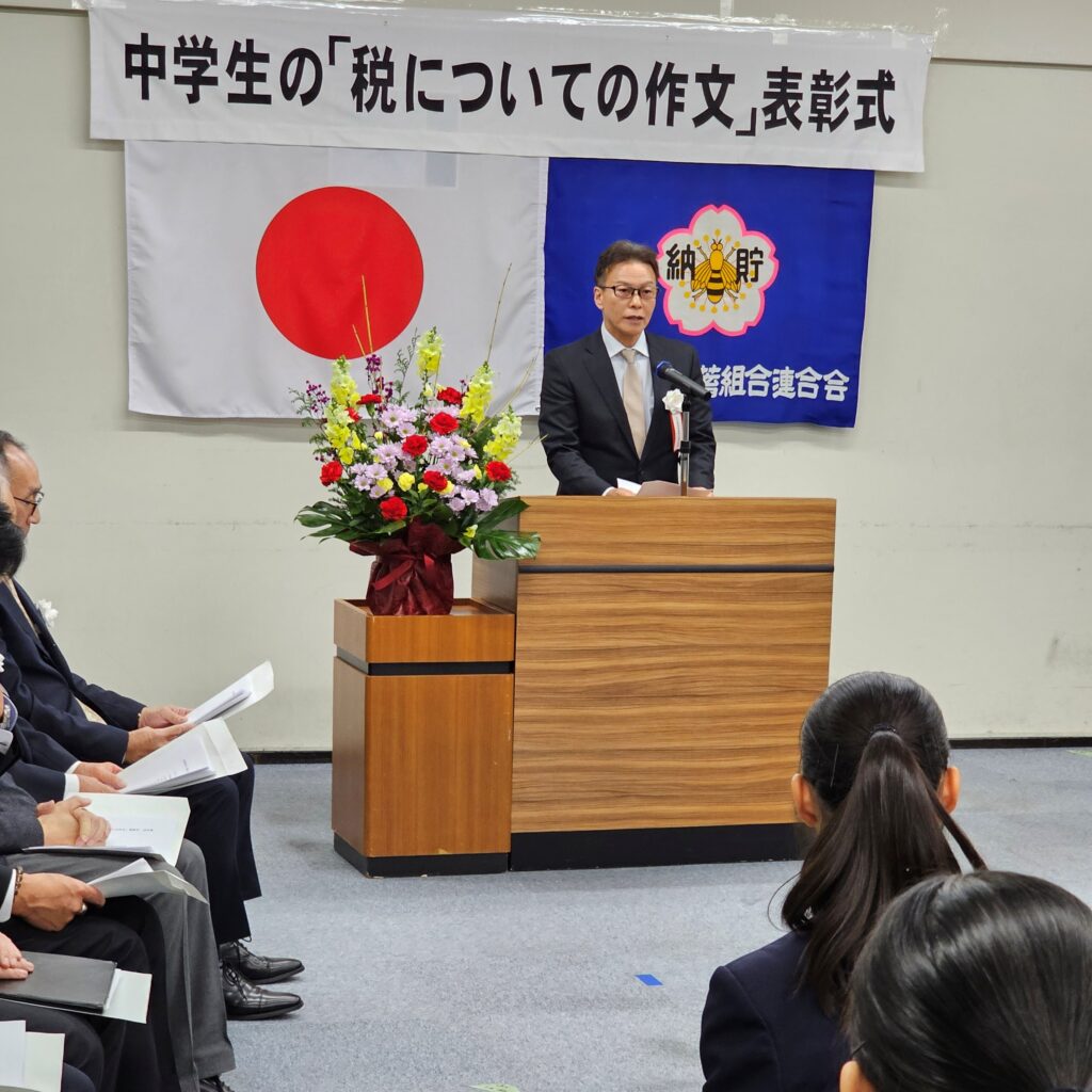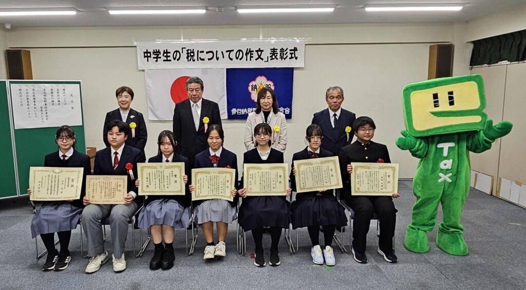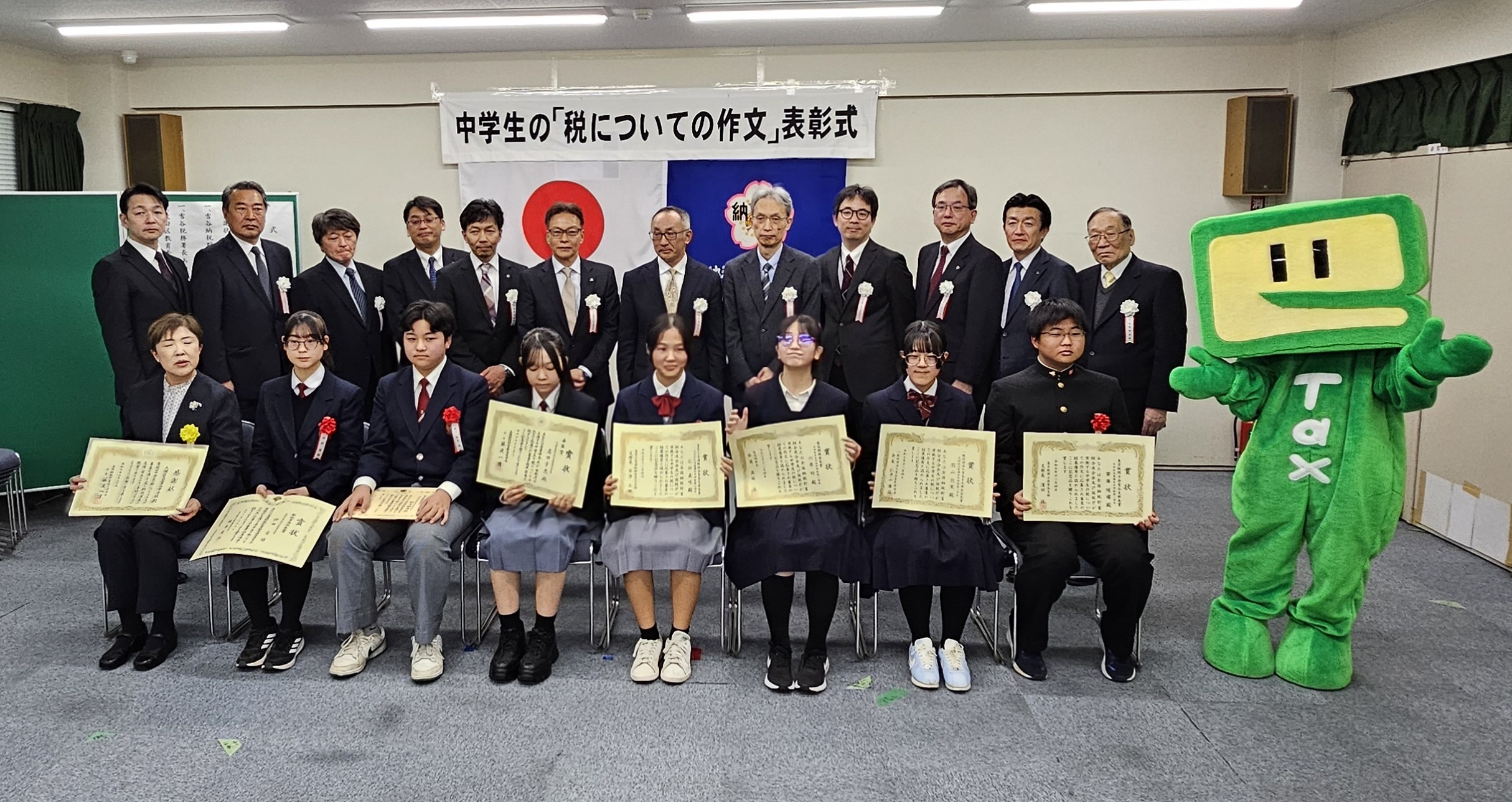 中学生の税についての作文表彰式 活動報告 2025.12.07 令和7年12 ⽉4⽇雪⾕税務署にて、「中学⽣の税についての作⽂表彰式」を開催しました。当⽇は、多数の参列者が⾒守る中、優秀賞受賞の⽣徒さんたちに対して、賞状と記念品等が贈呈されました。