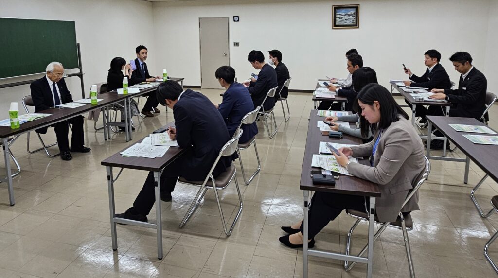 昨年度は嶺町集会室大会議室で実施しましたが、本年度はより実務に即した研修を行うことを目的として、金融機関の支店での開催となりました。講師を務めた坂元統括国税徴収官と受講行員の皆さまとの距離が近かったことから、スマートフォンの操作等についても、各受講者のペースに合わせて進めることができ、より効果的な研修となりました。