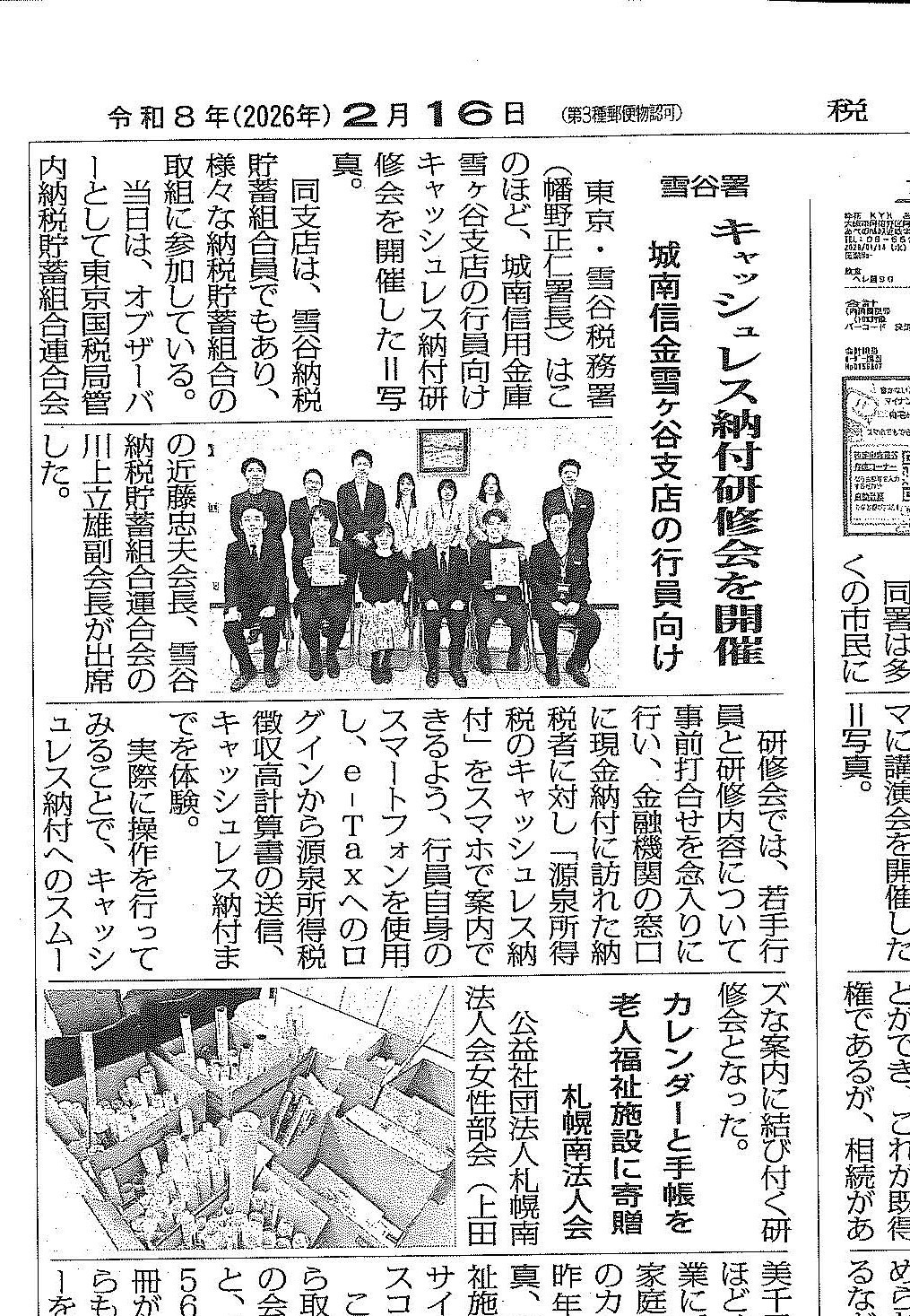 キャッシュレス納付研修が「税のしるべ」に搭載されました 活動報告 2026.02.19 令和7年12月5日、城南信用金庫雪ヶ谷支店において実施しました金融機関向けキャッシュレス納付研修会が令和8年2月16日の「税のしるべ」に掲載されました。 キャッシュレス納付研修記事1ダウンロード 金融機関向けキャッシュレス納付研修会 | 雪谷納税貯蓄組合連合会